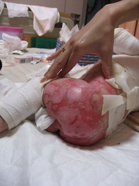 每日數小時的換藥包紮,不但對病人是每日的酷刑,對於照顧病人的家人也是難以想像的痛苦重擔。